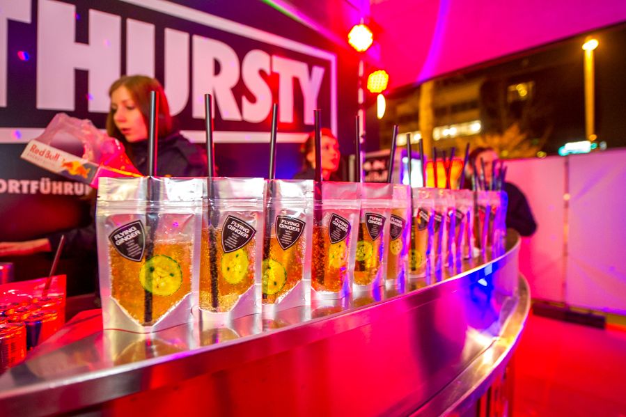 Bei der Red Bull One Night Affair in Stuttgart werden die Besucher mit einem besonderen Welcome-Dink begrüßt: Flying Ginger, einer der Siganture Drinks von Red Bull wurd in einer eigens für den Event angefertigten "Drinktüte" serviert. So begeisterte nicht nur der neue Drink, sondern auch die Darreichungsform.